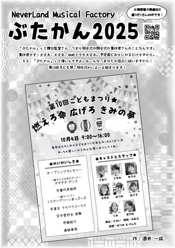 この「ぶたかん」は、座付き作家の酒井が2007年高校の演劇部のために書き下ろした作品です。高校の文化祭の開会式を舞台に、ステージを支えるスタッフたちの奮闘を描きました。NeverLand Musical Factoryでは2010年に取り上げ、千葉県富津市の子ども祭や千葉市での主催公演で上演しました。この時は、地域の子ども祭に高校生がボランティア・スタッフとして参加する設定にしました。
